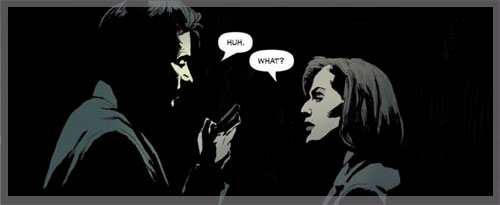 We begin this story with the agents searching for a leopard in a dark warehouse. Amid the amusing banter, Mulder receives a text, and following his gut, he leads Scully through the warehouse. Naturally, the agents end up trapped, locked in a dead-end and about to become kitty chow, but just in the nick of time a zookeeper comes to their rescue, tranquilizing the cat and saving our dynamic duo.