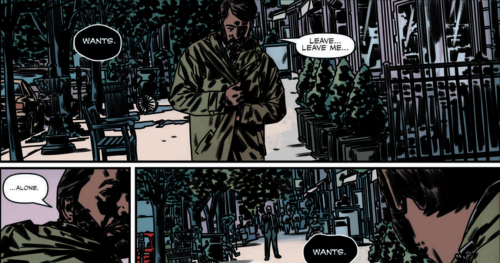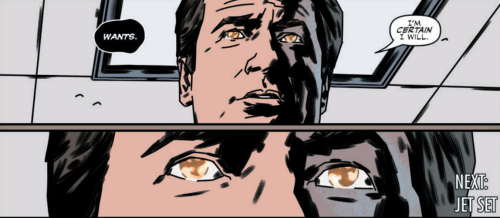 Mulder isn’t answering his phone and has a bunch of missed calls from Scully. She leaves a voicemail pleading with him to call her back. She says that he was right and that it definitely wasn’t a radicalized Islamic plot that led Fayed to take his life. But Mulder doesn’t take the call and instead boards the plane, the voices in his head echoing the ones that led Fayed to take his life. The final panel is an ominous one as we leave the issue on Mulder’s eyes, filled with fire.