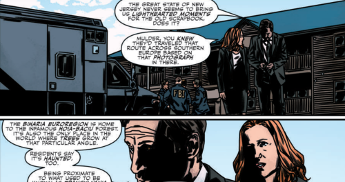 After the meeting, we rejoin Mulder and Scully outside as he quips about the “great state of New Jersey” not bringing them any lighthearted moments for the old scrapbook. Meanwhile, Scully questions how he knew they travelled across southern Europe by a photograph. It’s a very Mulder-Scully moment and I swoon a little. This panel could be ripped from any episode of the television series and I am reminded how much I miss the good old days.