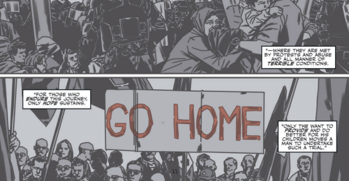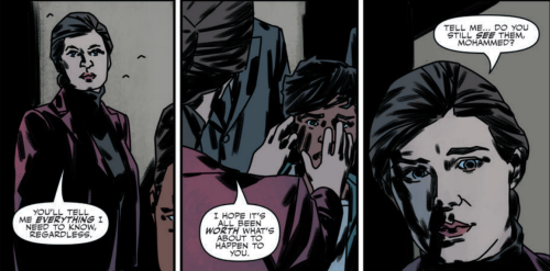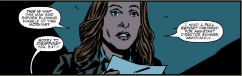 Cut to FBI headquarters, where AD Skinner is waiting for them with a Mr. Firas Ben-Brahim who helms a charity foundation that sponsors refugees. We spend the next few panels learning of the refugee crisis and I thought Harris did a good job handling the situation with sensitivity while also laying the groundwork to cast doubt about Qasim’s motives.