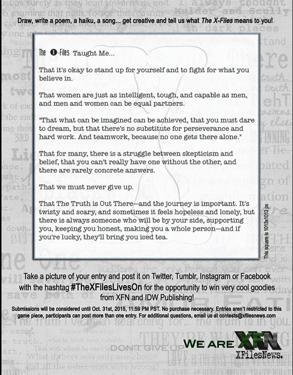 By Twitter user @SpookyCala, this entry takes the first prize! The XFN team felt it embodied so much of what this fandom means to many of us, and has taught indeed great values to generations of fans. Click on the image for the full size version of her entry.